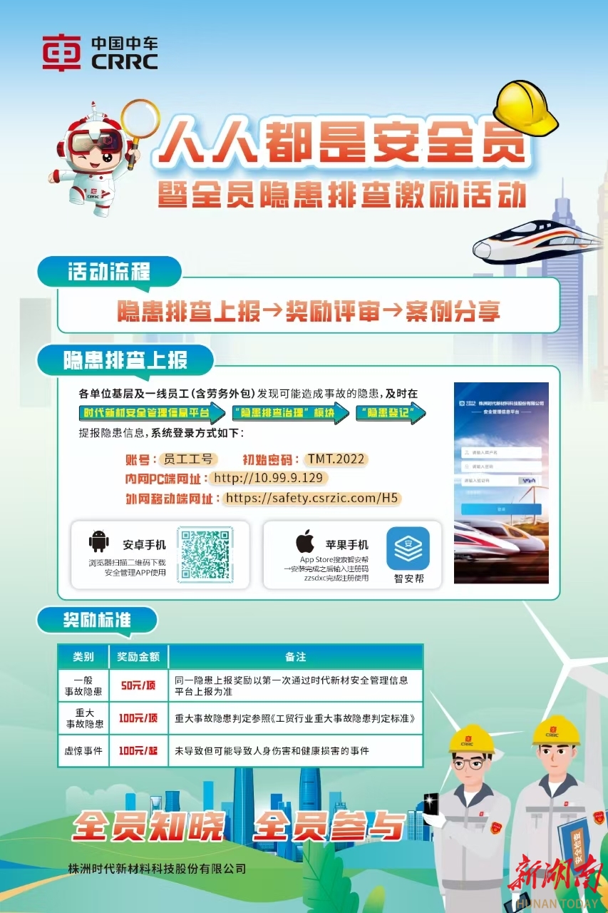 为深化执行《国务院安全出产委员会关于推进树立完善出产经营单位事故危险内部陈述奖赏机制的定见》、压实全员安全出产责任制,年代新材于2024年7月22日发动“人人都是安全员”暨全员危险排查鼓励活动,方针直指引导职工从“要我安全”向“我要安全”改变,全方面提高危险排查办理效能。